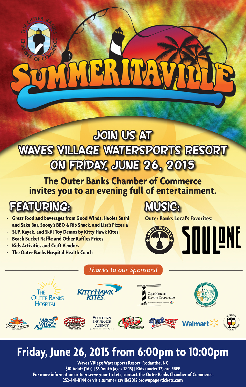 “The Outer Banks Chamber of Commerce, Resort Realty, The Outer Banks Hospital, Kitty Hawk Kites, and Waves Village Watersports Resort are pleased to present the 3rd Annual Summeritaville Music Event. This year’s event will be held from 6 p.m. – 10 p.m. on Friday, June 26, 2015 at Waves Village Watersports Resort in Rodanthe, NC. Other event sponsors include OneBoat Local Networks, Cape Hatteras Electric Cooperative, Haoles Sushi and Sake Bar, Outer Beaches Realty, Hatteras Recycle, and Southern Insurance.