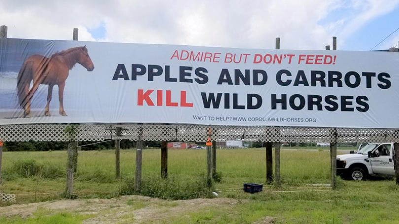 A 10-foot by 60-foot billboard message has been erected in Coinjock stating “Admire Don’t Feed! Apples and Carrots Kill Wild Horses,” intended to make the public aware that wild horses cannot eat any food that is not from their natural habitat of beach grasses.