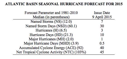 “The Tropical Meteorology Project at CSUpredicts that the season will see below-average activity, “anticipat(ing) that the 2015 Atlantic basin hurricane season will be one of the least active seasons since the middle of the 20th Century.”