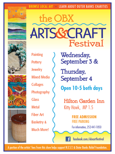 “If you are looking for a fun and inspiring way to spend the day, stop by the OBX Arts & Craft Festival at the Hilton Garden Inn in Kitty Hawk (oceanfront at milepost 1.5 on the Beach Road). Meander through booths of beautiful artwork and discover two local charities that are doing great things for the Outer Banks.