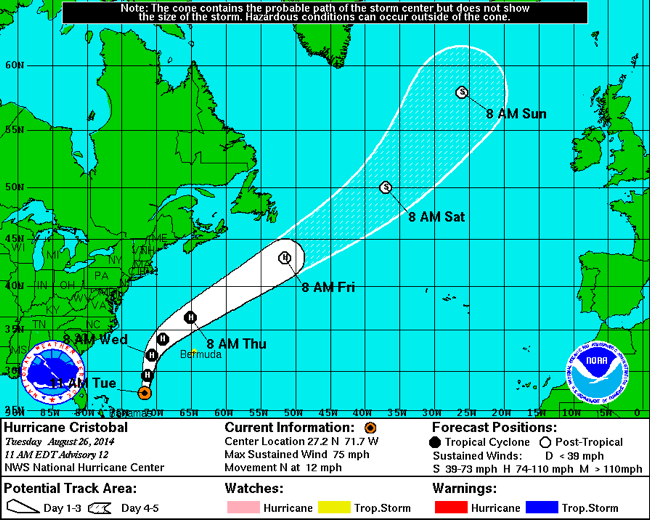 National Hurricane Center track for Hurricane Cristobal, Tuesday, 8/26, 11 a.m.